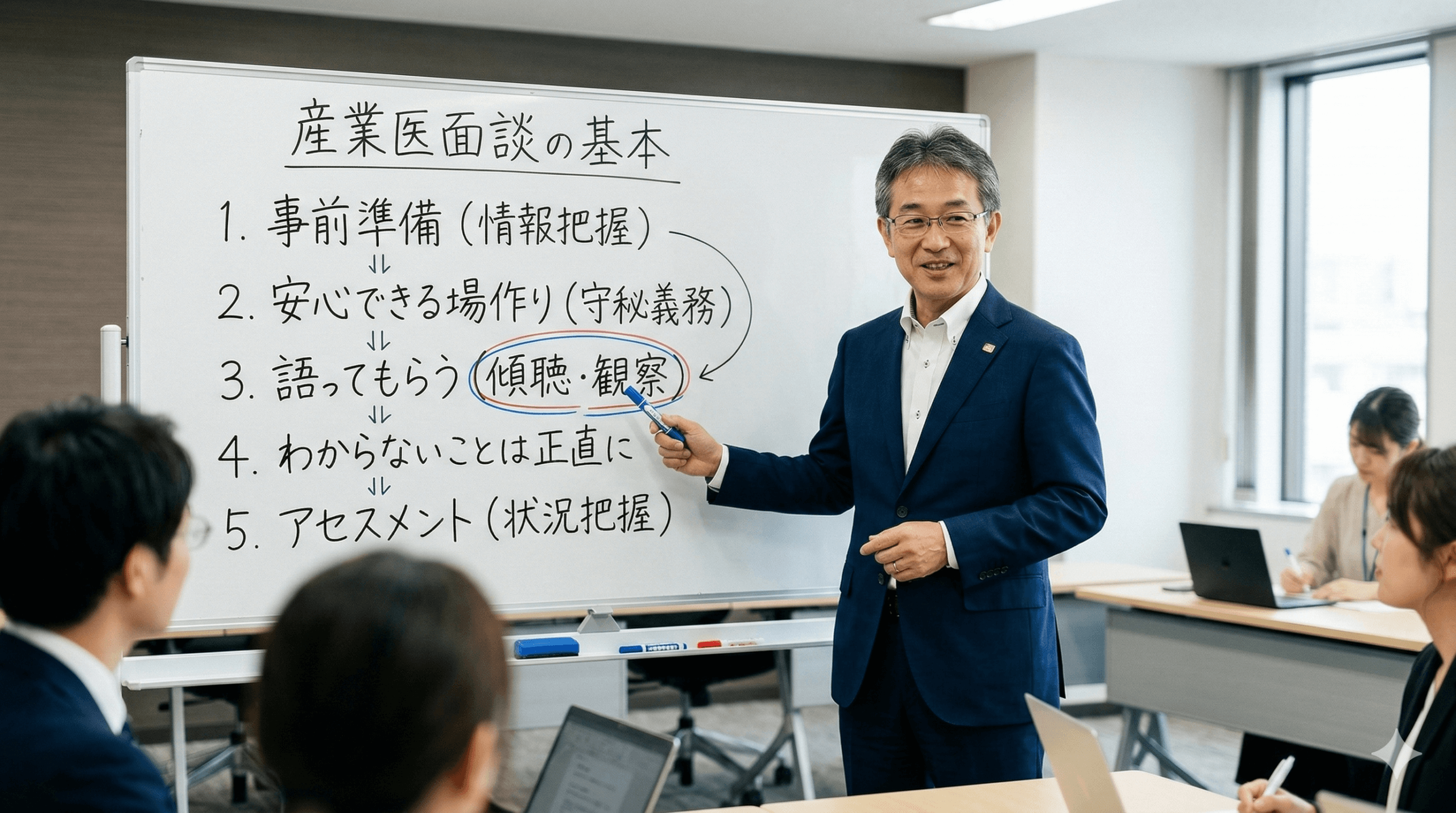 具体的には、産業医の役割と面談の目的、守秘義務の範囲を説明します。会社や上司に伝える内容については、面談の最後に本人に説明して同意を得ること、それ以外は伝えないことを説明します。「安心して話していい場だ」という理解が、率直な対話につながります。