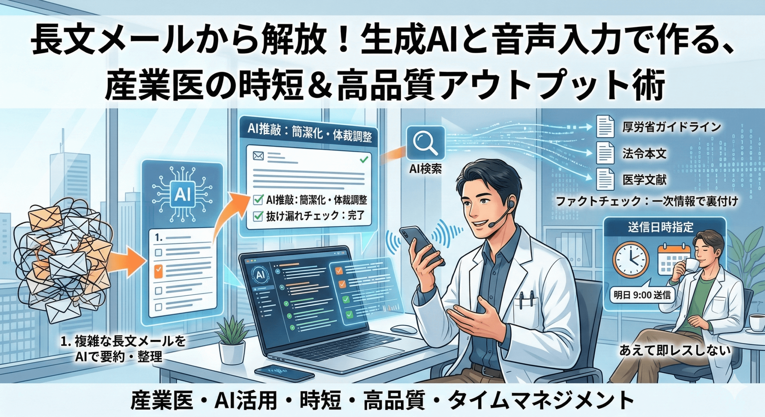 産業医の実務では、人事担当者から、ケース対応や職場の安全管理対策などについて、複雑な経緯の相談や問い合わせのメールを受け取ることがよくあります。いくつもの返信が連なった長文のメールは、質問の意図や状況を把握するだけでも一苦労です。そこで今回は、私が日々の業務で実践している「生成AIを活用した時短とクオリティアップの工夫」をご紹介します。