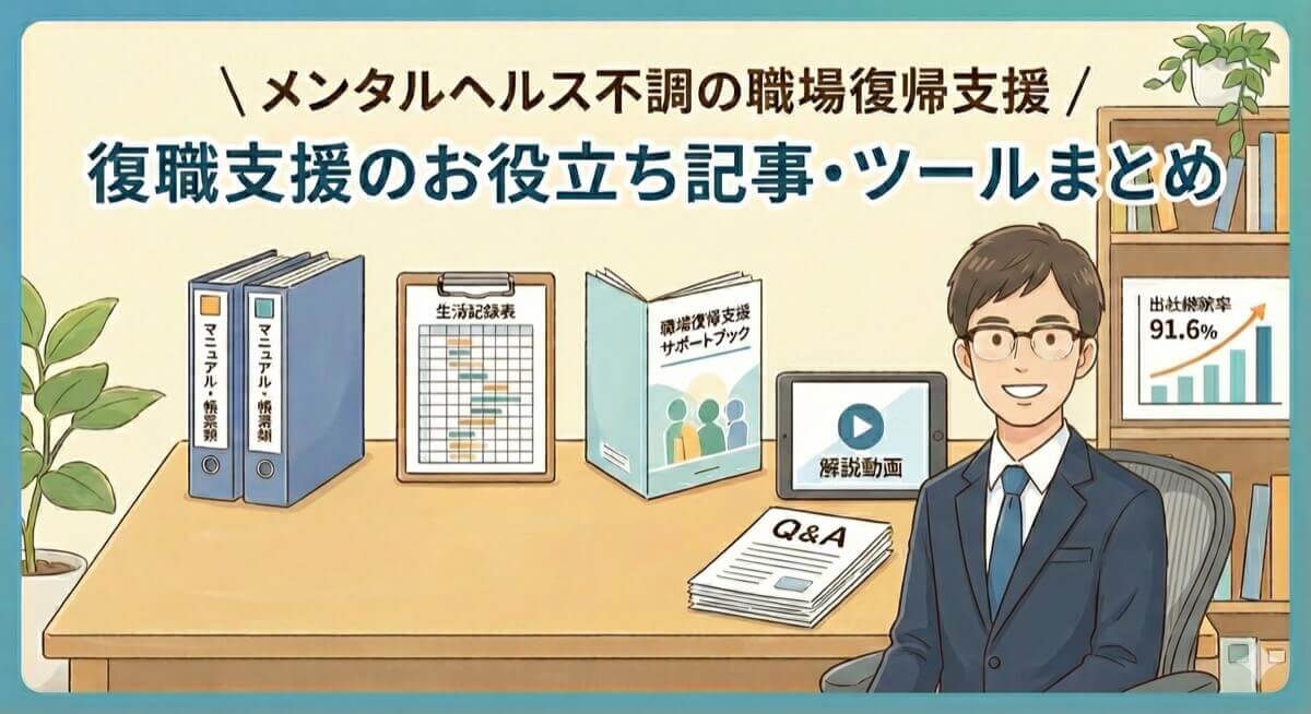 - メンタルヘルス不調の職場復帰支援 解説動画:メンタルヘルス不調の職場復帰支援の流れやポイントを解説した動画を公開しています。