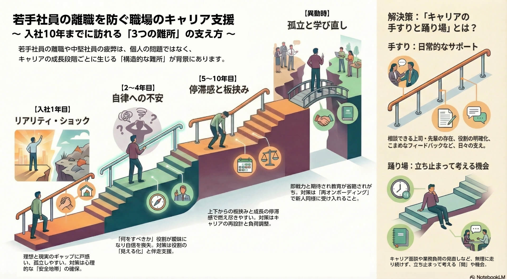 こうした難所を本人の努力だけで乗り越えさせるのではなく、それぞれの段階に、あらかじめキャリア開発の「手すり」(日常的なサポート)と「踊り場」(立ち止まって考える機会)を設けておくことが有効です。